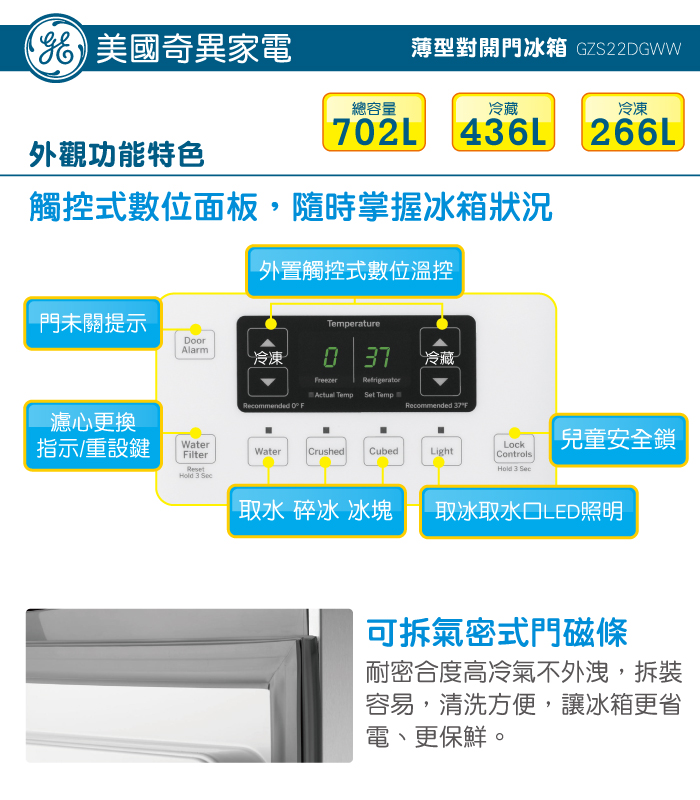 美國 奇異GE 薄型對開冰箱 GZS22DGWW